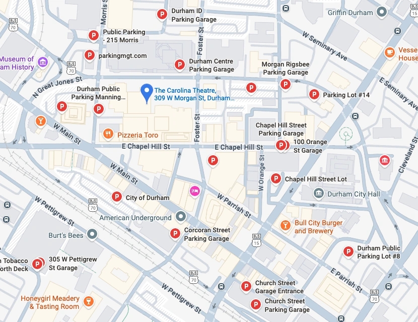Hwy. 70: Take “Durham Downtown” exit, Exit #177-A and follow Hwy. 15-501 Business South (Mangum St.) for approximately 1 mile. Turn Right onto Morgan St. Carolina Theatre is 3 blocks on the left, across from the parking garage.